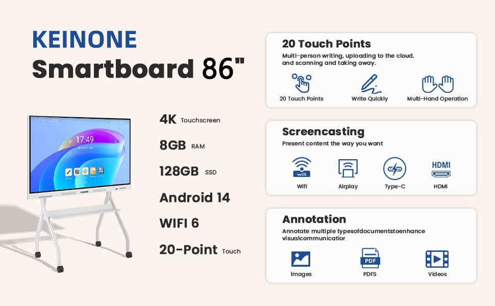 Keinone Smart board 86"inch 4K 8GB+128GB SSD Android OS Touch Points 20
